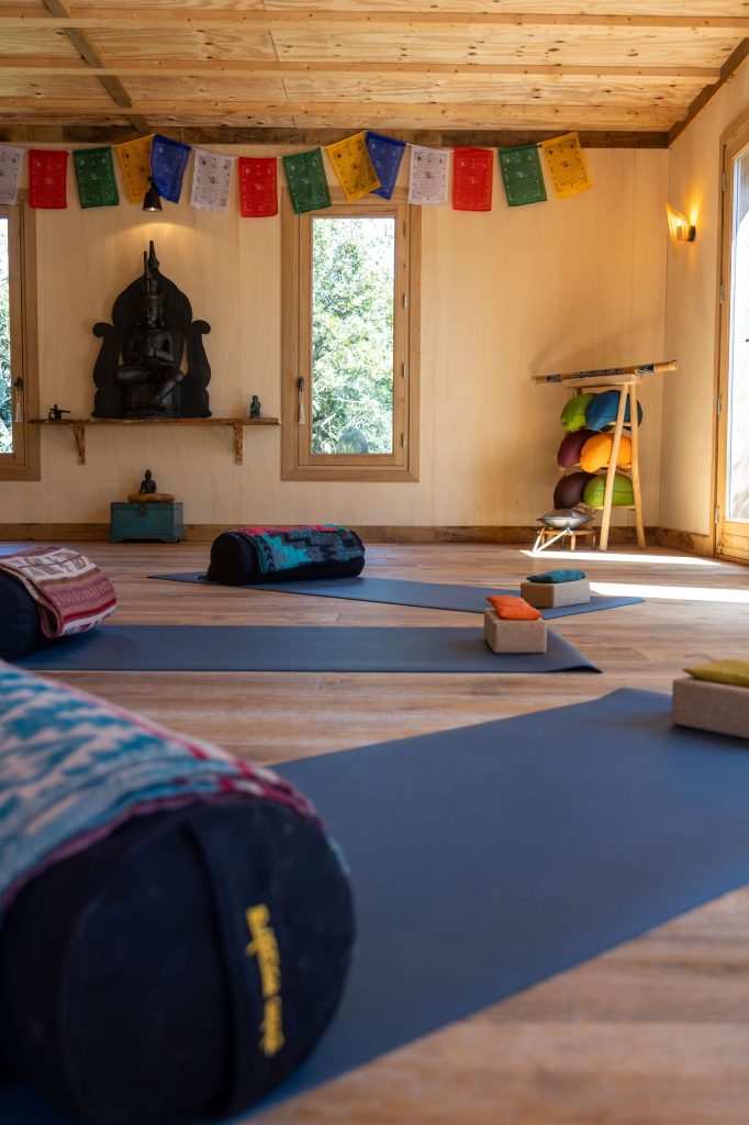 Notre espace de pratique a été conçu comme un cocon suspendu dans la végétation.